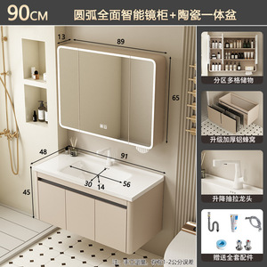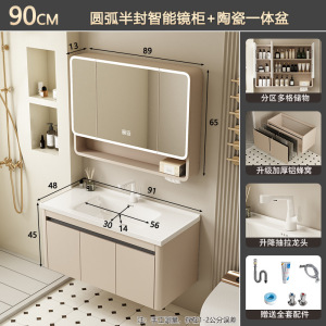 奶油风/91CM盆柜-【智能全封圆弧镜柜】