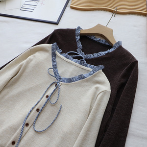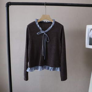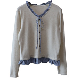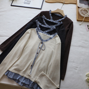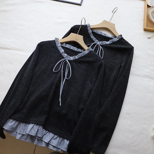[比正]2025秋季新韩版假俩件格子木耳边拼接系带百搭针织衫女5130
