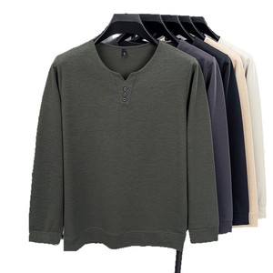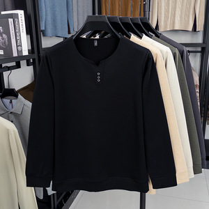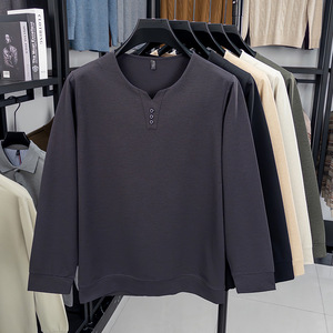 秋季新款长袖男装T恤纯色上衣独特V字领口纽扣装饰款时尚休闲长袖