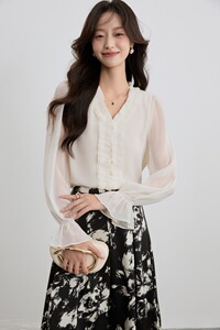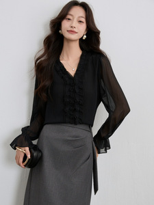 25新款法式v领蕾丝衬衫通勤上衣拼接新款长袖上衣