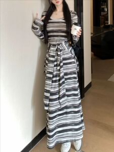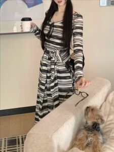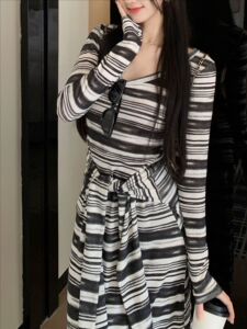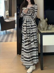 famouswag2025年早秋季新款慵懒圆领针织条纹长袖连衣裙女小个子