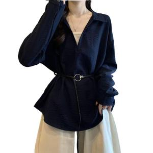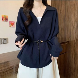 大码女装设计感衬衫女新款胖MM显瘦上衣V领系带收腰假两件洋气