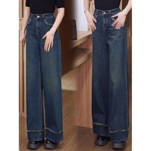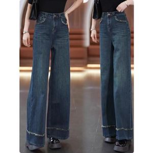 复古深蓝色直筒牛仔裤女2025年春秋季新款高腰宽松垂感毛边阔腿裤