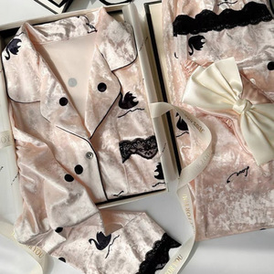 【金丝绒黑天鹅】法式天鹅睡衣女秋冬金钻绒睡衣蕾丝花边丝绒套