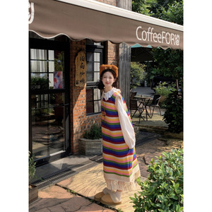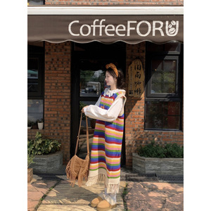 肥柒柒 大码设计感百搭纯色娃娃领衬衫+流苏彩虹中长款针织背心裙
