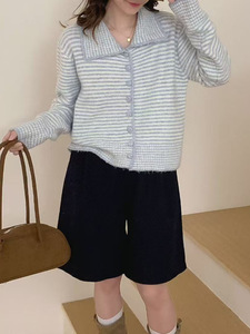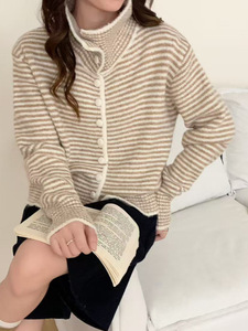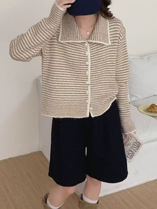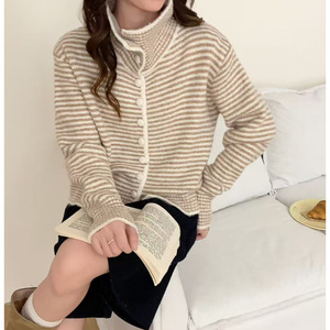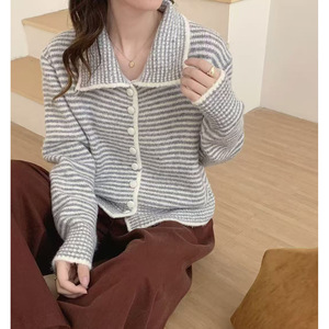 跨境复古条纹翻领毛衣女韩系休闲宽松秋冬新款拼色针织开衫上衣