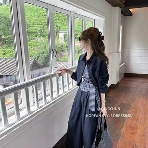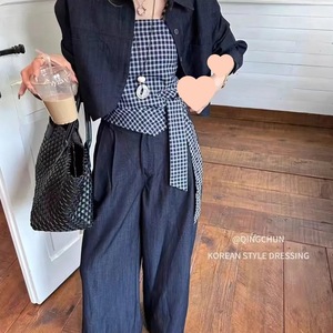 韩系格子吊带时尚套装女2025秋装新款一整套穿搭阔腿裤开衫三件套