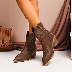 复古尖头中跟短靴女2025秋季新款刺绣英伦风大码套筒切尔西靴批发