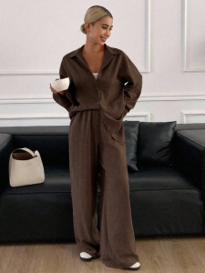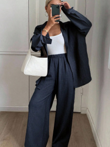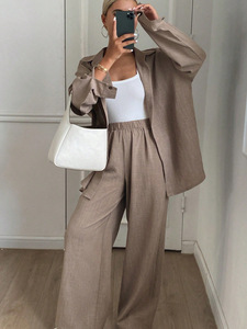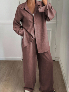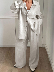 2025秋季新款休闲慵懒风套装宽松亚麻长袖衬衫上衣女+长裤两件套