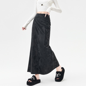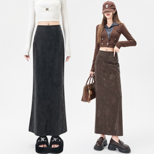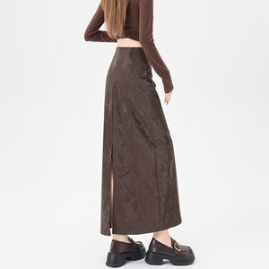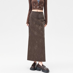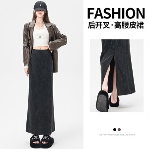 咖色皮裙半身裙中长款秋冬女装直筒后开叉垂感PU一步裙长裙A7142