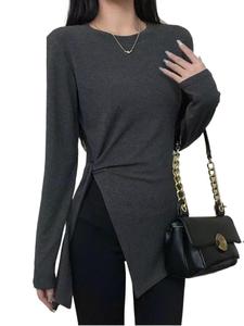 大码胖mm不规则开叉系带中长款长袖T恤女新款秋修身显瘦正肩上衣