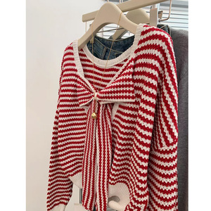红色条纹蝴蝶结长袖针织衫毛衣女士设计感上衣韩系氛围感早秋穿搭