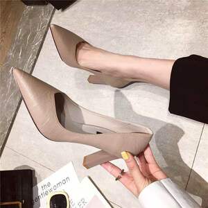 2025春秋新款网红法式黑色高跟鞋女粗跟小清新裸色职业尖头单鞋夏