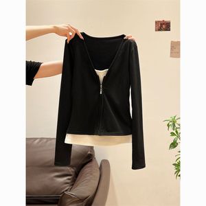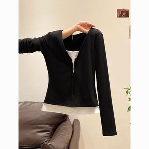 黑色拉链领拼接假两件长袖恤打底衫女春秋季法式显瘦设计感上衣