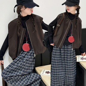 跨境女童秋装2025新款儿童韩系中大童时髦皮衣马甲女孩休闲格子裤