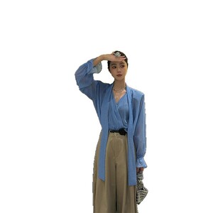 飘带韩系山波点气质蓝色力达雪纺衫女衬衫上衣感领微透迪休闲