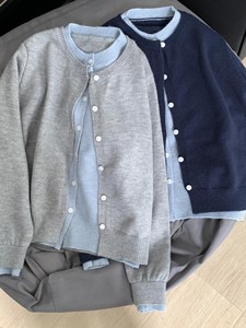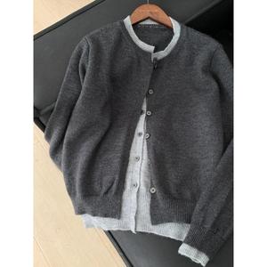 秋季韩系拼接撞色假两件灰色针织开衫外套女慵懒外搭毛衣上衣