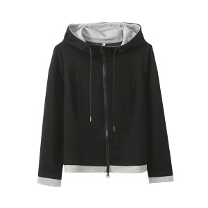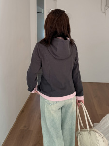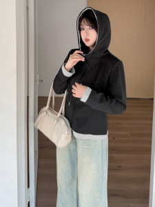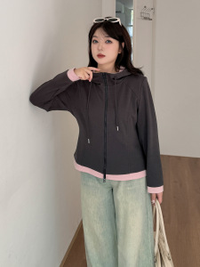 伊诺大码女装撞色连帽卫衣外套2025秋新款韩系慵懒修身上衣333213