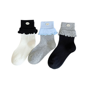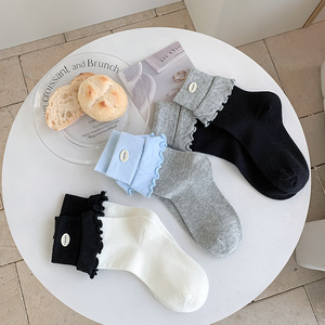翻边纽扣袜子女2025秋冬新款拼色中筒袜无骨木耳边堆堆袜韩国袜子