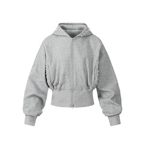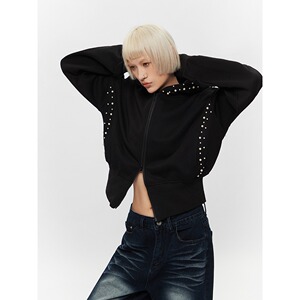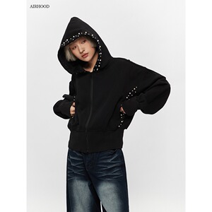 跨境美式拼接铆钉短款连帽卫衣女款秋季潮牌设计感情侣短外套男