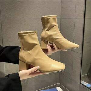 加绒靴子女粗跟2025春秋短靴中跟马丁靴英伦风方头网红弹力瘦瘦靴
