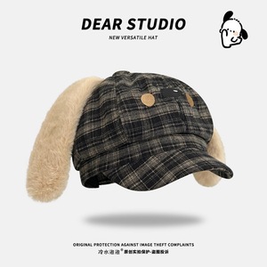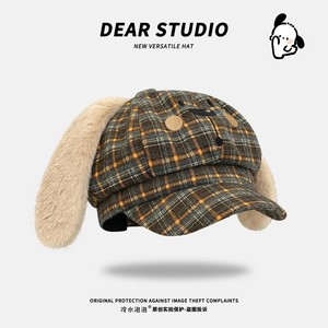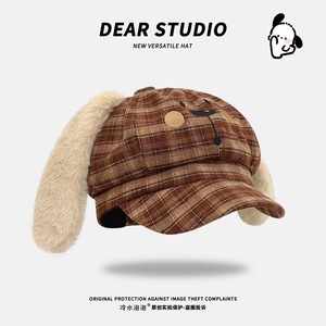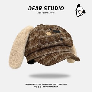 日系可爱小狗耳朵格纹贝雷帽子女春秋季新款休闲百搭显脸小八角帽