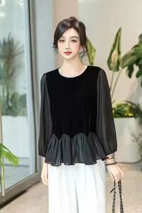 汉派品牌专柜2025秋季新款优雅名媛丝绒拼接木耳边钉珠长袖小衫09