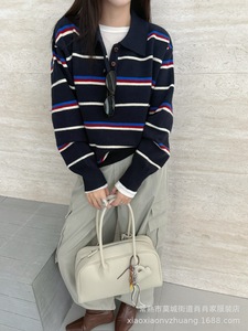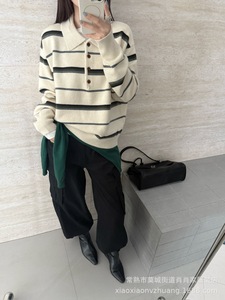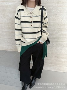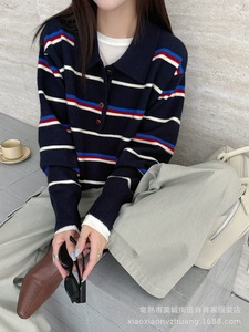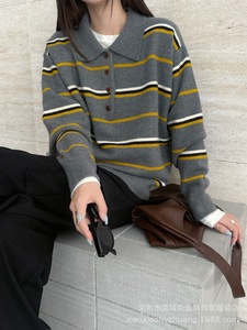 2025新款复古秋冬撞色彩条纹翻领拼接宽松毛衣慵懒百搭针织上衣女