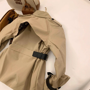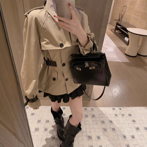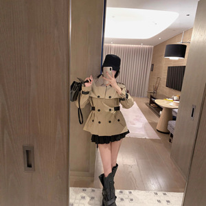 D25秋冬新款英伦风卡其色短款韩系收腰双排扣风衣外套
