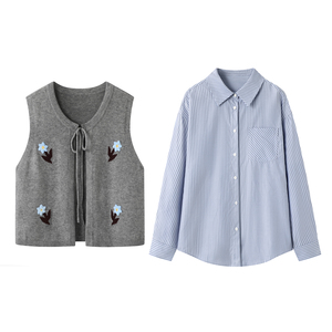 熙!花朵刺绣灰色叠穿漂亮减龄绑带针织马甲polo领宽松衬衫两件套