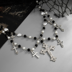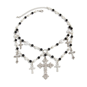 欧美跨境甜酷哥特十字架流苏项饰品 辣妹项链短款珍珠choker项圈