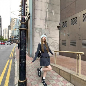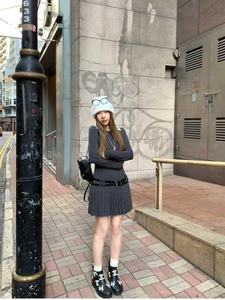 2025年早秋新款灰色针织修身连衣裙女长袖假两件短裙设计感百褶裙