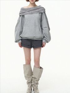 CZZPN 博尔赫斯斜肩一字领慵懒风宽松套头连帽卫衣露肩上衣女