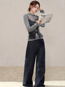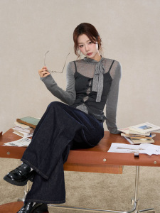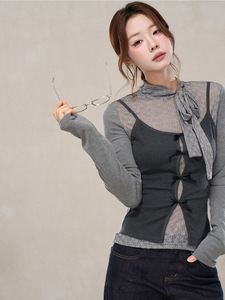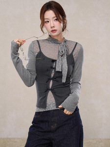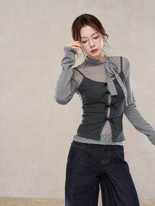 韩系纯欲风蝴蝶结系带长袖t恤女秋季内搭修身短款吊带上衣两件套