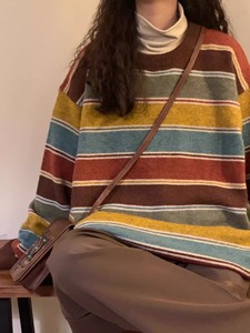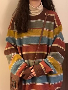 跨境美式秋冬新款宽松复古条纹针织衫上衣学院风圆领百搭毛衣外穿