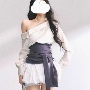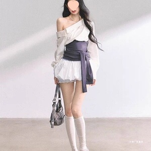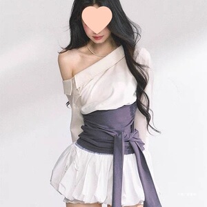 法式斜肩辣妹长袖恤上衣套装夏季新款收腰设计花苞裙两件套串珠