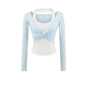 扭结拼接假两件长袖T恤女秋小众露锁骨挂脖短款修身收腰甜辣上衣