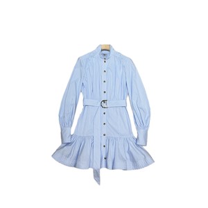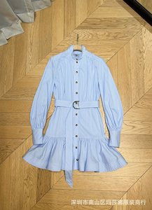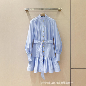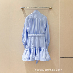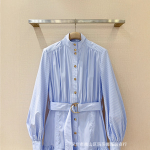 法式南油25早秋新款混色条纹设计感收腰显瘦百褶衬衫领长袖连衣裙