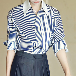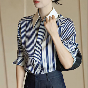 2025秋季新款女气质洋气设计感撞色拼接条纹长袖衬衫宽松显瘦上衣