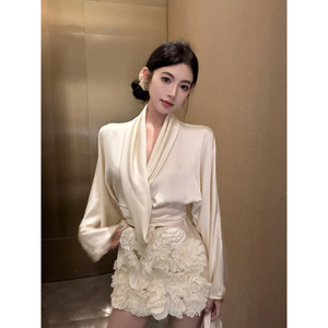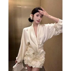 昕可达【抖音同款】【高光时刻】老钱风缎面深v褶皱收腰上衣