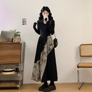 大码 设计感长袖连衣裙女秋季2025新款冷淡风黑色不规则内搭长裙