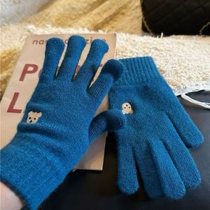 韩国新款秋冬季可爱小熊刺绣毛线针织分指五指手套触屏露指女纯色