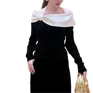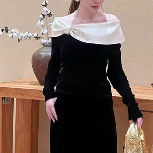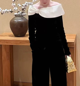 南油女装设计感一字肩蝴蝶结撞色上衣2025早秋款法式时尚小衫长袖