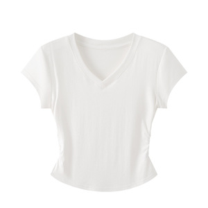 正肩V领短袖T恤女夏季新款百搭收腰显瘦高级感小众ins上衣女