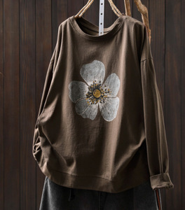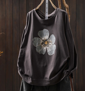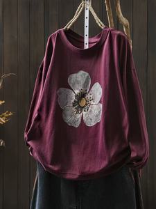 秋季新款 长袖t恤女花朵印花宽松内搭外穿圆领套头上衣8187