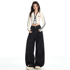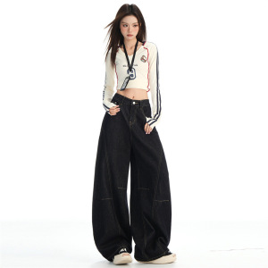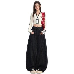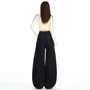 2025秋季新款复古弯刀牛仔裤女宽松垂感拼接设计百搭显瘦阔腿裤潮