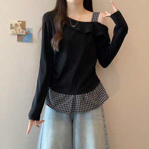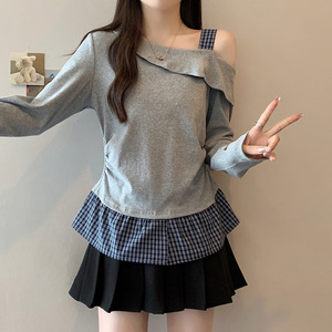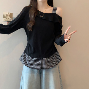 2025秋装新款胖MM时尚设计感拼接格纹露肩长袖T恤