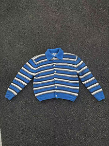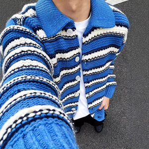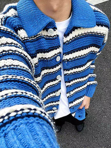 蓝白条纹开衫毛衣美式复古cleanfit粗线针织翻领外套男潮宽松上衣