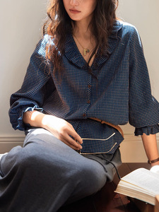 solighter 法式复古V领荷叶边格子衬衫女秋季