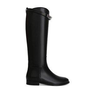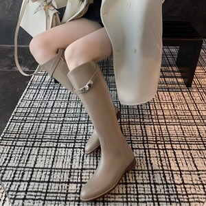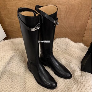 现货秒发!苏茵茵同款鞋牛皮斜口*锁扣侧拉链粗跟高筒骑士靴秋冬